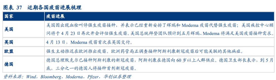 截至4月16日,美国新冠疫苗累计接种数量突破2亿剂,每日新增接种数量升至335万剂。 美国食品药品监督管理局表示,强生公司研发的新冠肺炎疫苗引发罕见血栓风险,目前 美国已有七个州暂停强生疫苗接种,美国政府正在与各方协调,帮助已预约强生疫苗的 接种者尽快改期接种辉瑞或莫德纳疫苗,未来美国可能会考虑增加辉瑞或莫德纳疫苗供给来填补强生疫苗停用所造成的缺口,而莫德纳公司表示疫苗生产难以显著加快,已削减对加拿大的新冠肺炎疫苗供应量,4月份还将降低对英国的疫苗供货量。