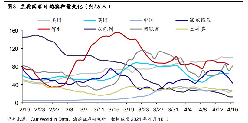 疫苗方面,主要国家接种速度保持基本稳定。截至 4 月 16 日,美国日均接种保持在 100.2剂/万人,同期中国日均接种回落为 26.0 剂/万人,英国为 64.4 剂/万人,均与上周基本持平。