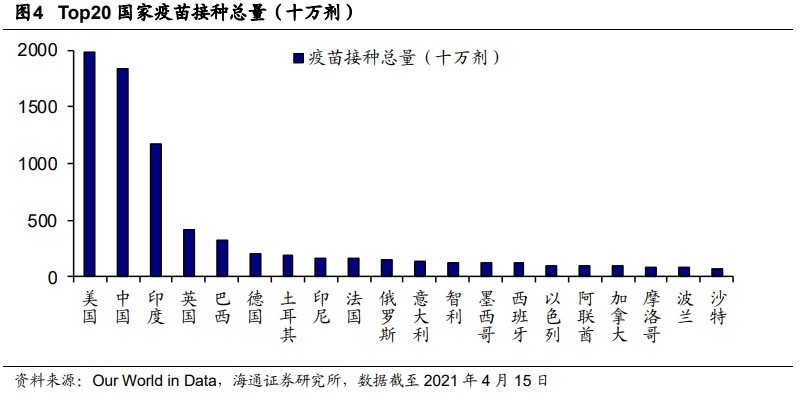 从疫苗接种总量来看,中国接种总量已接近美国。截至 4 月 15 日,中国已累计接种 1.84 亿支疫苗,同期美国累计接种 1.98 亿支。
