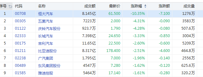 汽车股周一表现强势,今日集体回落,截至发稿,恒大汽车(00708)跌10%,五菱汽车(00305)跌4.31%;庆铃汽车股份(01122)跌4.28%;长城汽车(02333)跌3.33%;广汽集团(02238)跌1.96%。