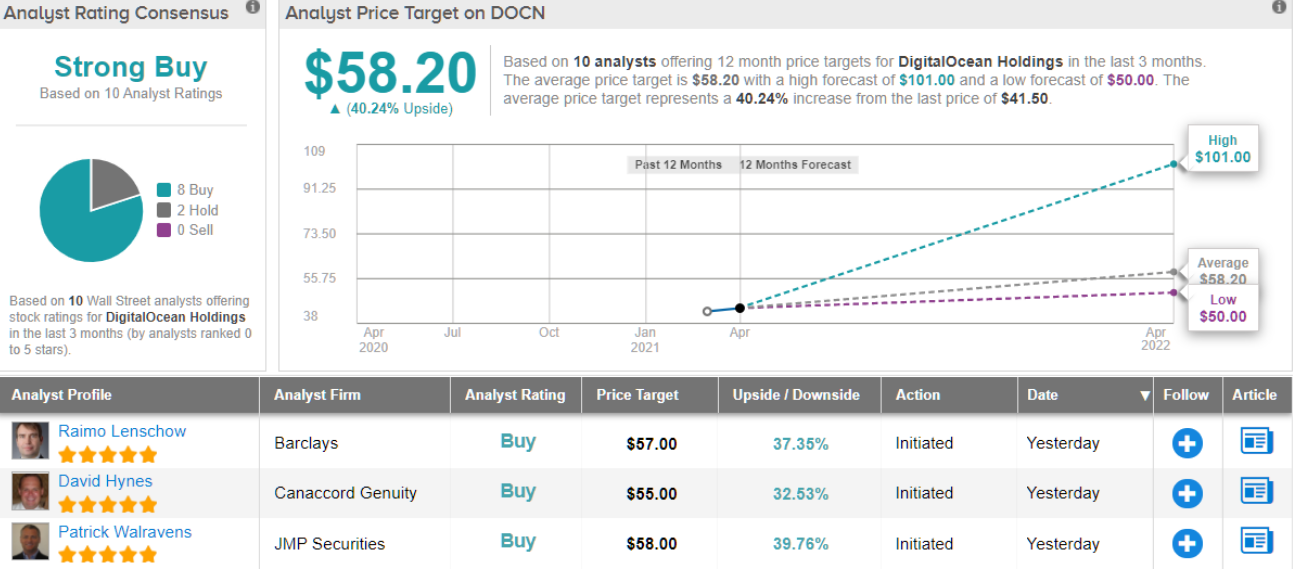 综合以上因素,高盛予DigitalOcean“买入”评级,目标价为101美元,意味着在未来12个月内其股价较当前水平存在140%的上行空间。在追踪该股的华尔街分析师中,有8位建议买入,2位建议持有,因此其分析师共识评级为“强烈买入”,平均目标价为58.20美元。