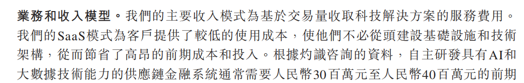 联易融在公司招股书中表明了公司业务收入构成,公司主要基于交易量收取科技解决方案的服务费用。由于采用了SaaS模式,从而降低了中小企业和融资成本和金融机构的审核成本。
