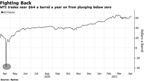 一年前,由于疫情和政府实施的封锁抑制了需求,石油交易商和生产商纷纷在陆地和海上贮存石油。由于没有地方储存多余的石油,WTI原油基准价格一度跌破零。本周,WTI原油价格最高每桶64美元左右。