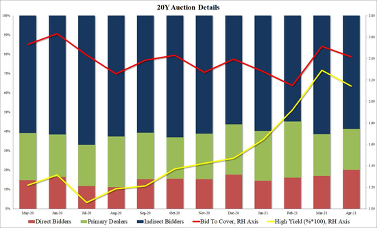 北京时间4月13日01:00,美国财政部进行了240亿美元的20年期国债标售。根据结束后的数据,本次标售的得标收益率为2.144%,而投标倍数则为2.42。值得注意的是,本次标售中负有防止流拍义务的一级交易商(Dealer)的获配为21.1%,创下去年5月恢复标售20年期国债以来的最低值。