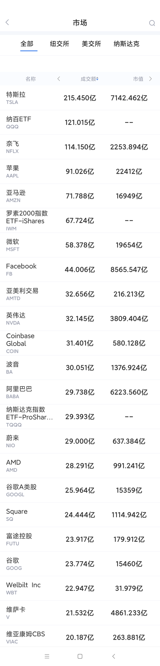成交额3至6位分别是苹果、亚马逊、微软和Facebook等科技行业巨头,这些股票涨跌幅均不足1%。