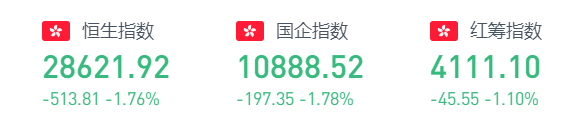 周三收盘,恒生指数跌513.81点或1.76%,报28621.92点。国企指数跌1.78%,报10888.52点,红筹指数跌1.1%,报4111.1点。
