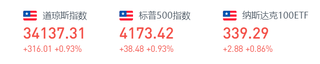 截至收盘,道琼斯指数涨316.01点,涨幅0.93%,报34137.31点;标普500指数涨38.48点,涨幅0.93%,报4173.42点;纳斯达克综合指数涨163.95点,涨幅1.19%,报13950.22点。