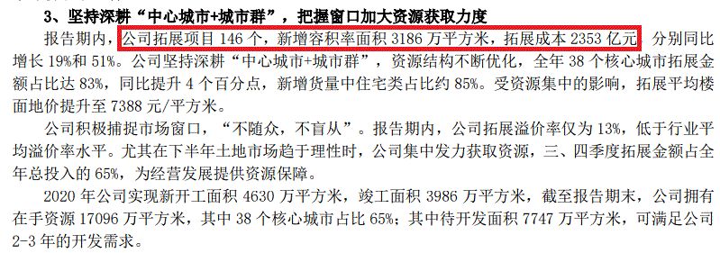 年报披露,2020全年下来,保利地产拓展了146个项目,新增建容面积 3186万方,拓展成本为2353亿元。后两个数据,分别同比增长19%和51%。