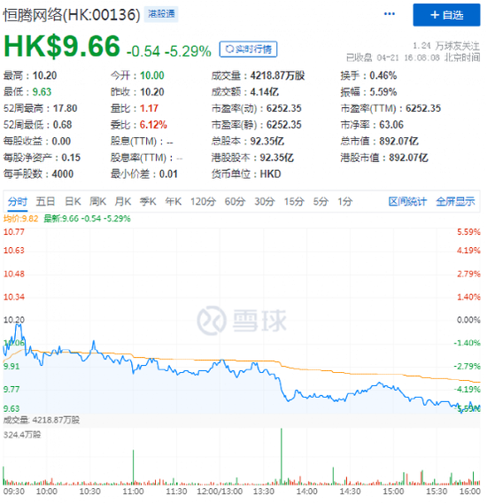 但令人不解的是,两家平台深度合作的消息,并没有给恒腾网络股价带来提振作用。4月20日港股开盘,恒腾网络处在高开低走的状态,截止当日收盘跌幅达3.95%。低迷的状态也延续到了21号,截止4月21日港股收盘,跌幅达到5.29%。