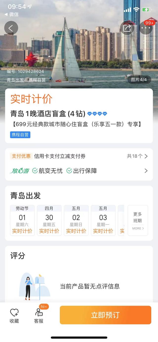 记者打开携程App,在首页中间明显位置就看到了“城市随心选盲盒”的入口,上面并标有“不喜欢全额退”等字样,记者点进去以后发现,盲盒种类分为酒店和机票两种,价格分别为99元、699元、999元三类。记者点开酒店类经典款“乐享五一”盲盒,该盲盒的适用日期为4月30日-5月4日,包含全国18个城市内其中一个的1晚酒店,预订成功后赠送机票红包,最高可获得100元立减红包。