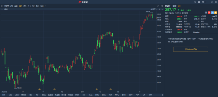 微软公司 (NASDAQ:MSFT)最近的表现好于大多数科技股,由于市场对其云服务的需求强劲,这家总部位于华盛顿雷德蒙德的科技巨头,4月19日股价攀升至了历史新高,达到261.47美元。自年初以来,已经累计上涨了16%,超过同期标普500累计10%的涨幅。目前,公司市值达到了1.93万亿美元,是美股市场中市值第二高的公司。