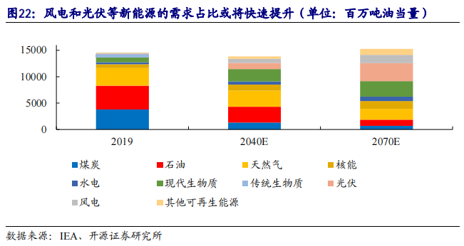 据开源证券,实现碳中和的关键是转换能源结构,提升非化石能源的发电比例。根据 IEA 预测,全球光伏和风能在总发电量中的占比将从目前的 7%提升至 2040 年的 24%,是转换能源结构的主力军。
