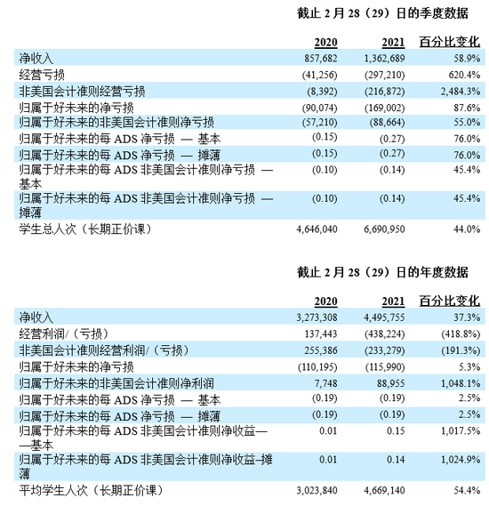 - 2021财年季度平均学生人次(长期正价课)从上年的约3,023,840增长到约4,669,140,同比增长54.4%。