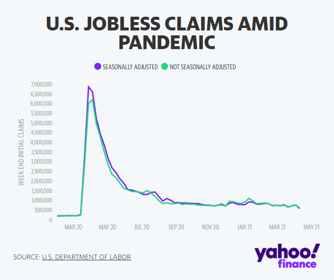 2020年3月13日,疫情封城之前的最后一次统计数据显示,四周平均初请失业金人数为23.25万人。而在2021年4月9日当周,这一数字为68.3万。
