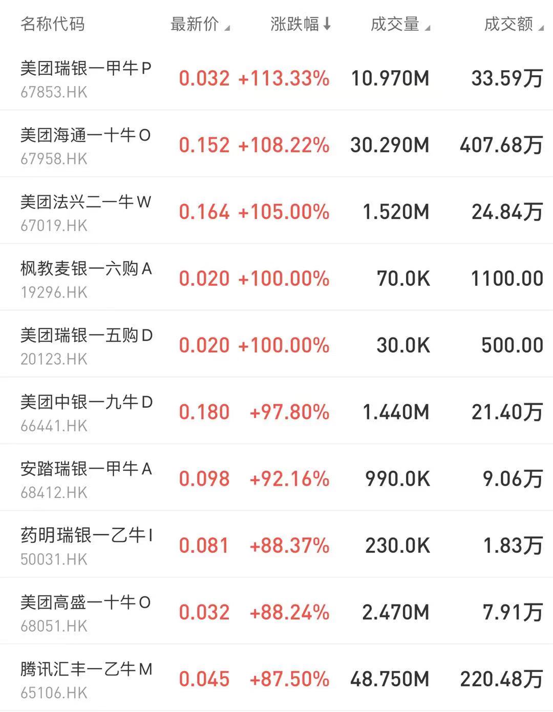 美团瑞银—甲牛P涨113.33%占据涨幅榜第一,但成交额不大。其次是美团海通—十牛O涨108.22%、美团法兴二—牛W涨105%。