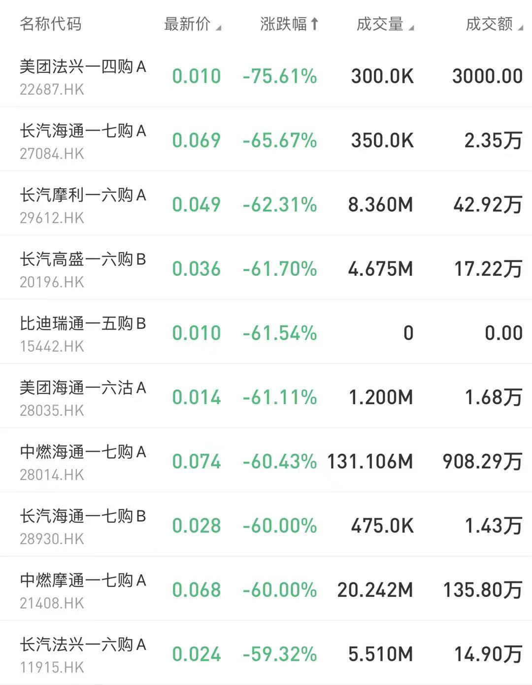 今日所有窝轮牛熊证合计成交189.83亿港元,占大市成交12.28%。