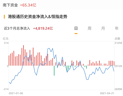 南下资金今日净流入港股65.34亿港元,而周二为净流入超54亿港元。