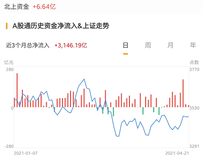 北上资金今日净流入6.64亿元,周二为净流入超13亿元。