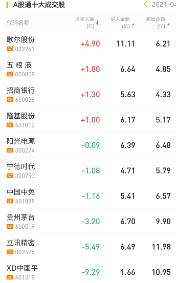 北上资金今日净买入歌尔股份4.9亿元,为今日买入之最。其次,净买入五粮液1.8亿元。