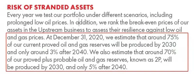 值得注意的是,在这份报告中壳牌指出,到2030年,其目前探明石油和天然气储量中将有75%将被开采出来,到2040年为3%;此外,到2030年,其探明储量及概算储量(Proved plus Probable reserves)的70%将被开采,到2040年为5%。换言之,能开采的,尽量早开采出来,“落袋为安”,降低资产搁浅的风险。