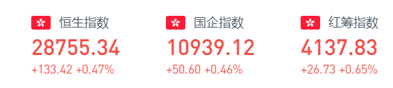 周四收盘,恒生指数涨133.42点或0.47%,报28755.34点。国企指数涨0.46%,报10939.12点,红筹指数涨0.65%,报4137.83点。