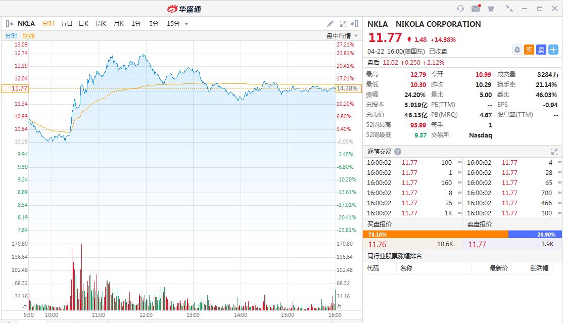 号称“卡车界特斯拉”的Nikola周四开盘后不久,Nikola盘中股价即直线冲高,最高一度升至每股12.79美元,涨幅超20%。截至收盘,Nikola涨幅回落至14.38%,每股价格报11.77美元。