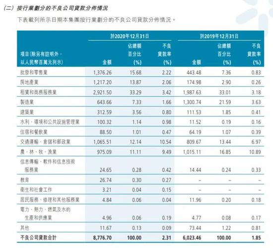业绩报告解释称,公司批发和零售业不良公司贷款较上年末增加,主要是经济下行及疫情等影响下,个别客户的销售收入明显下降,资金链紧张形成不良;房地产业不良公司贷款较上年末增加,主要是个别房地产客户对外投资项目较多,或商业项目租金收入未达预期,导致资金链断裂;租赁和商务服务业不良公司贷款较上年末增加,主要是个别客户投资失败,资金链断裂形成不良。