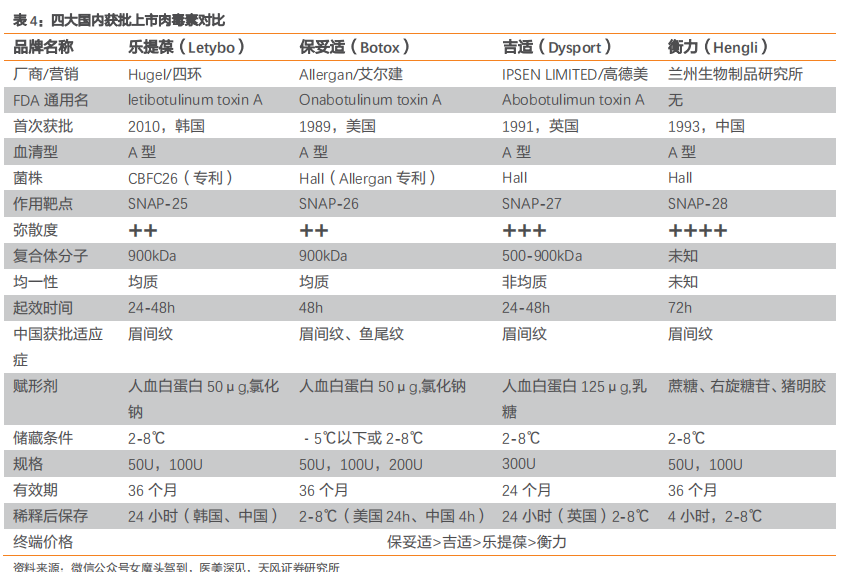 之前国内获批的肉毒素产品主要有艾尔建botox和兰州所的衡力,这两者各自占据了50%的市场份额。2020年,两家新产品获批,包括四环医药和hugel合作的肉毒素letybo和英国的吉适。