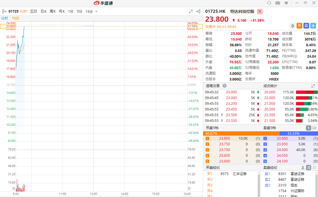 华盛资讯4月23日消息,恒达科技早盘续涨50%再度冲高破顶。截至发稿,恒达科技涨51.59%,现报23.8港元每股,最新总市值为71.4亿港元。值得注意的是,该股自获香港航天科技集团收购1.91亿股及折让45.95%提现金要约,两个交易日暴涨逾500%,市值升超60亿港元。