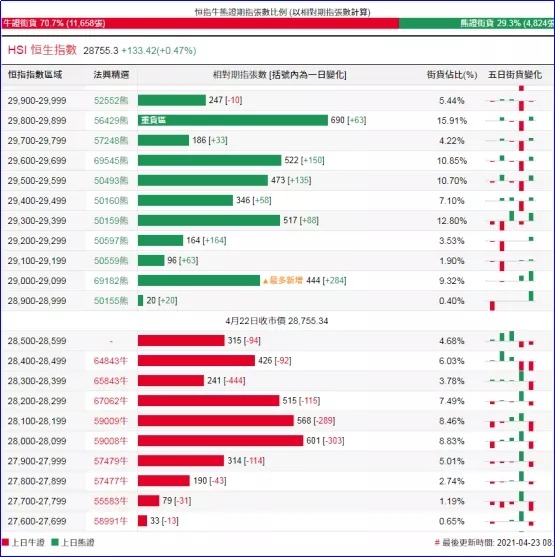 街货分布方面,至周四,恒指牛证街货在收回价28000点至28600点之间,累计相当约2666张期指合约;恒指熊证街货在收回价28900点至29700点之间,累计相当约2582张期指合约。