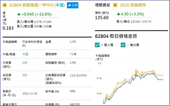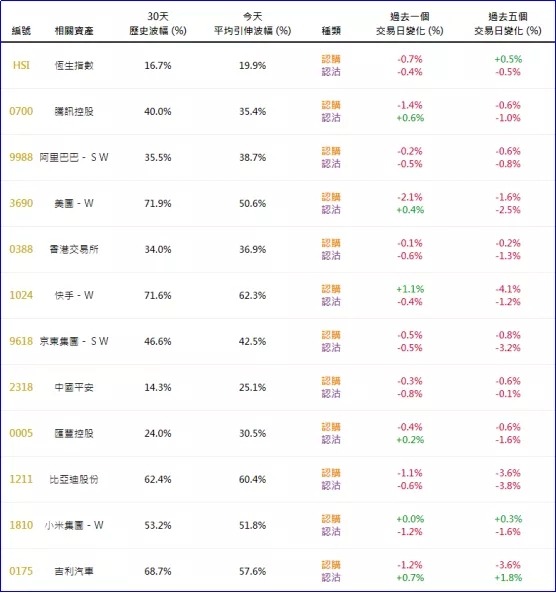 周四恒指相关权证的平均引伸波幅报约19.9%,按日下降0.7个百分点。个股方面,腾讯控股、阿里巴巴、美团、比亚迪股份、吉利汽车等相关认购证的引伸波幅均按日下降;腾讯、美团、吉利相关认沽证的引伸波幅则按日有所调升。