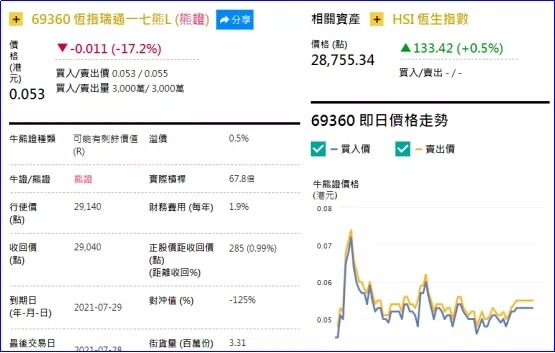 2、看错方向:恒指瑞通一七熊(69360.HK),周四下跌17.19%。
