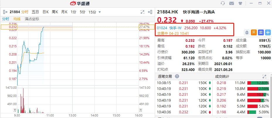 相关窝轮方面,快手海通一九购A大涨27.47%,成交额1798万港元,其行使价为300.2港元,2021年9月1日到期,溢价率26.23%。