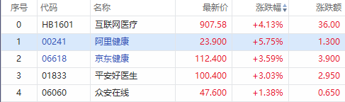 截至发稿,阿里健康涨超5%,京东健康、平安好医生涨超3%。