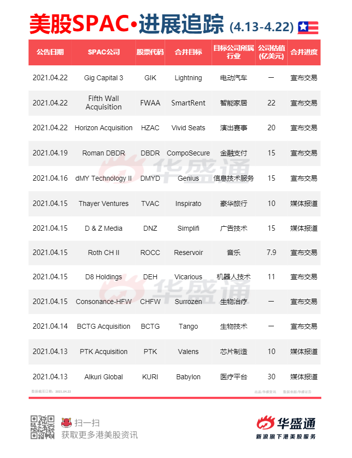 机构最新数据显示,现在仍有400多个SPAC公司在寻求各种各样的交易,而在刚刚过去的一两周时间内,13宗交易正在进行中(具体信息已经在下表整理好了)。