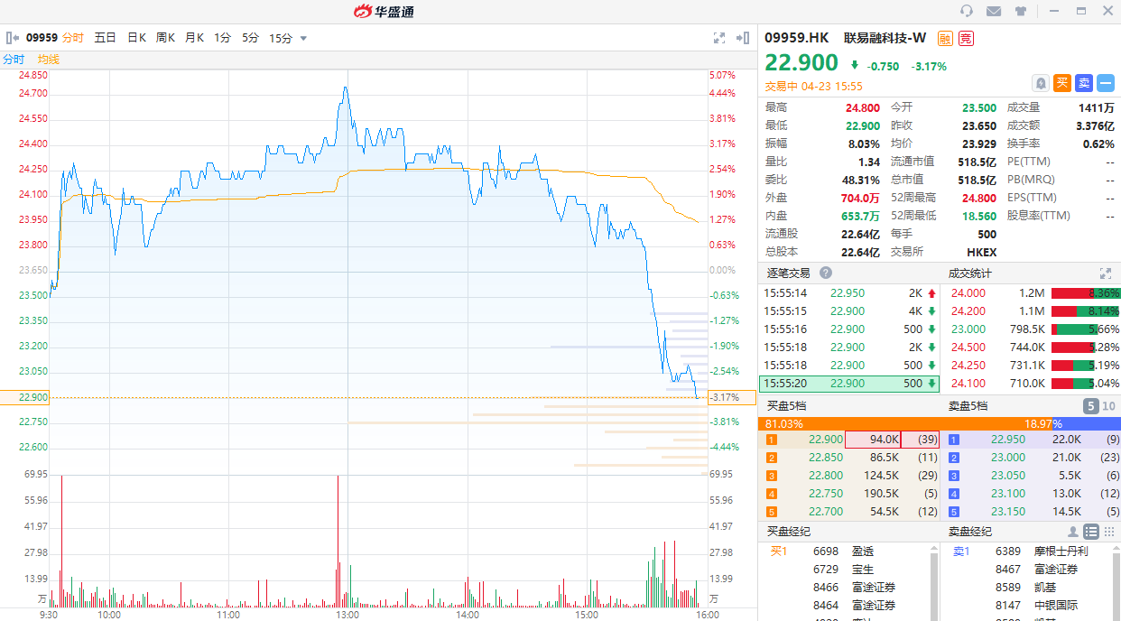 华盛资讯4月23日消息,联易融尾盘直线下跌逾3%。上午一度冲高破顶,最高见24.8港元。截至发稿,联易融跌3.17%,报22.9港元每股,成交额高达3.376亿港元。