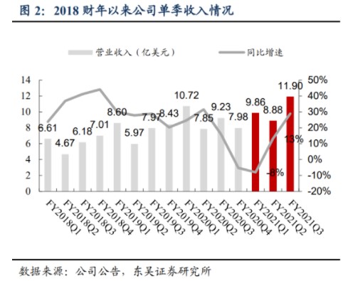 2021财年Q3(截至2021年2月28日止三个月),新东方营收为11.9亿美元,同比增长29%,超出上季度的业绩指引和彭博一致预期(约11.4亿美元)。