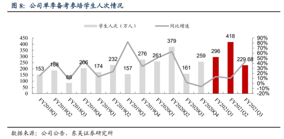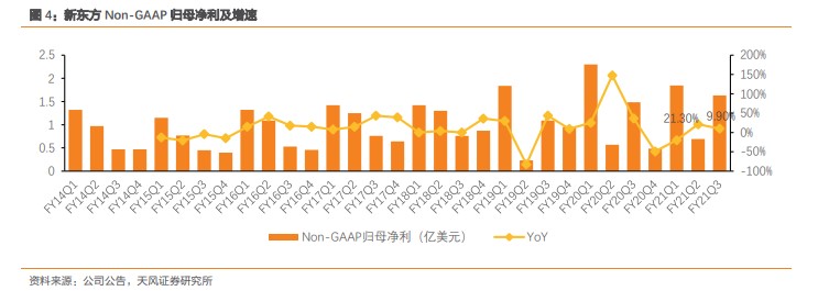 新东方同时给出了2021财年Q4的财务指引,预计其营收同比增速为38%-43%,约在11.0亿美元-11.4亿美元之间。