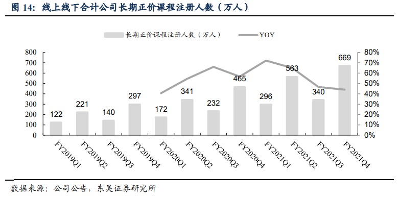 好未来收入的大幅增加得益于长期正价课报名人数的增长,本季度注册人数达到669.1万,同比增长了44%。