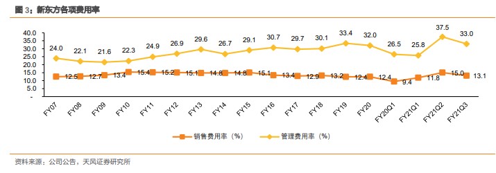 逆势扩张并不以牺牲财务健康为代价,本财季新东方的营销费用率(销售费用/营收)为13.1%,同比微增但环比降了2个百分点。经营费用率(一般及行政费用/营收)为33%,波动同样有限。最近两年来,新东方这两项费用比率均保持平稳、波动幅度较小,一定程度上体现其较好的成本费用控制能力。