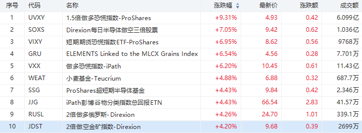 周四,美股盘中剧烈波动,“拜登拟对富人征收高达43.4%资本利得税”的消息一出,美股应声下跌,最终三大指数悉数收跌,均跌近1%。受市场情绪影响,隔夜涨幅居前的均与恐慌指数和做空类相关。 从ETF涨幅榜来看,居首位的是1.5倍做多恐慌指数(UVXY),收涨9.31%,成交额达6.099亿美元;做多恐慌指数(VXX)涨超6%,成交11.43亿美元;每日三倍做空半导体股票ETF(SOXS)收涨7.05%,成交1.036亿美元;两倍做空金矿指数的ETF(JDST)涨超4%,成交额2699万美元。