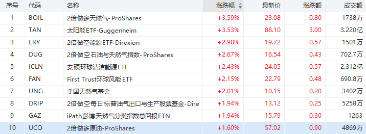 适逢全球气候峰会召开,清洁能源相关ETF连续走高,天然气价格持续上涨。隔夜,两倍做多天然气ETF(BOIL)收涨3.59%,成交1738万美元;太阳能ETF(TAN)涨3.53%,成交3.22亿美元;安硕环球清洁能源ETF(ICLN)涨2.43%,成交2.312亿美元。