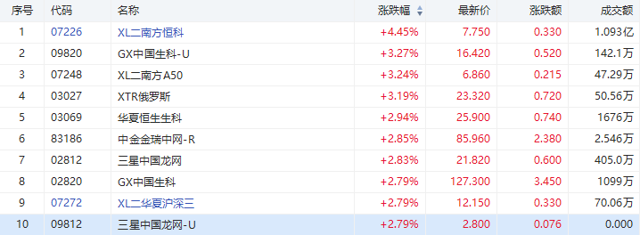 受消息影响,今日港股涨幅居前的ETF有南方两倍做多恒科(07226.HK),上涨4.45%,成交额1.093亿港元。昨日涨幅领先的GX中国生科-U(09820.HK)今日继续走高,收涨3.27%,成交额142.1万港元;GX中国生科(02820.HK)亦走高,收涨近2.8%。