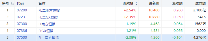 受消息影响,今日港股涨幅居前的ETF有南方两倍看多恒指(07200.HK),收涨2.54%,成交2.18亿港元;南方两倍看空恒指(07500.HK)走弱,跌2.38%,成交4.276亿港元。