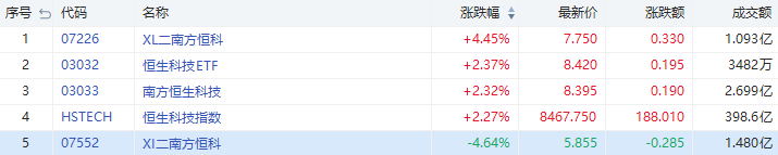 看空恒指相关ETF走弱,其中南方两倍做空恒科(07552.HK)大跌4.64%,成交额1.48亿港元。