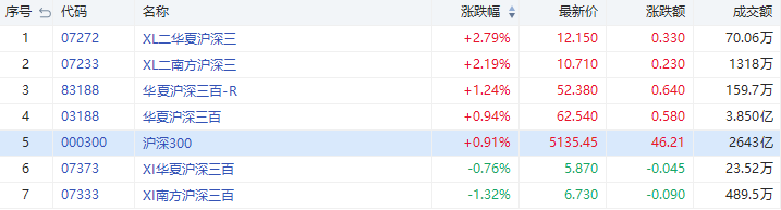 沪深300指数收涨0.91%。其中,华夏两倍做多沪深三(07272.HK)大涨2.79%,成交量70.06万港元;华夏沪深三百ETF(03188.HK)收涨0.94%,成交额3.85亿港元。