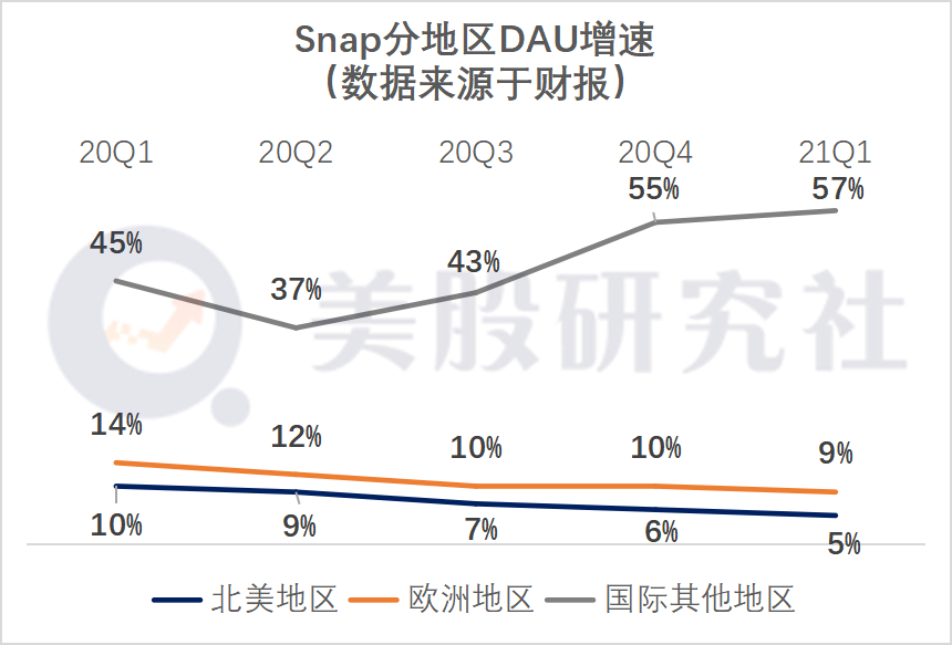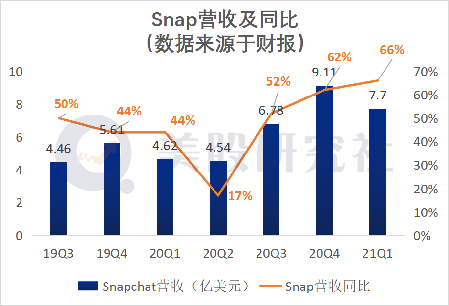 财报显示今年一季度,Snap实现营收7.7亿美元,同比增长66%,已经连续三个季度维持50%以上的高速增长。在去年,Snap吃足了疫情的红利,从疫情的防控角度来看,今年全球疫情虽然迎来拐点,但随着传染性更强的变种病毒的出现,美国仍在维持防疫政策,人们的线上娱乐时间并不会减少,Snap在一季度继续获得疫情红利。