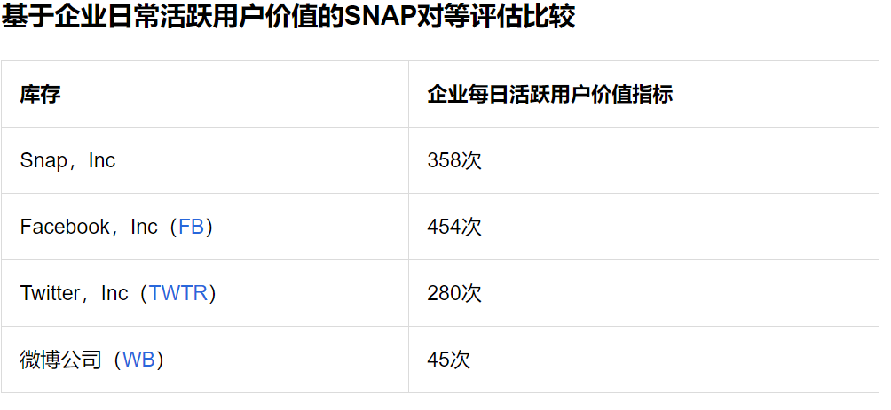一位华尔街分析师从用户日活角度,分析了Snap与一些社交平台的企业价值。根据数据发现相比与Facebook、Twitter、微博等公司,Snap被明显高估。另外facebook的APRU值是Snap的三倍,市值近9000亿美金,今年以来股价共上涨近11%,而snap的股价上涨了30%,体现出Snap的溢价较高。