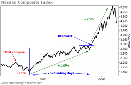 贝瑞研究资深分析师Greg指出:过去一年纳斯达克综合指数的表现与互联网泡沫破碎之前的表现极为相似。1998年长期资产管理崩溃引发33%跌幅的抛售之后,纳斯达克综合指数在1999年呈现出了逐步增长的势头(达到了115%的涨幅),并于暴跌后的第267个交易日冲上历史高点。直至1999年底突破了阻力位,于2000年3月底突飞猛进增长了75%(记住这些数字,等下会用到)。