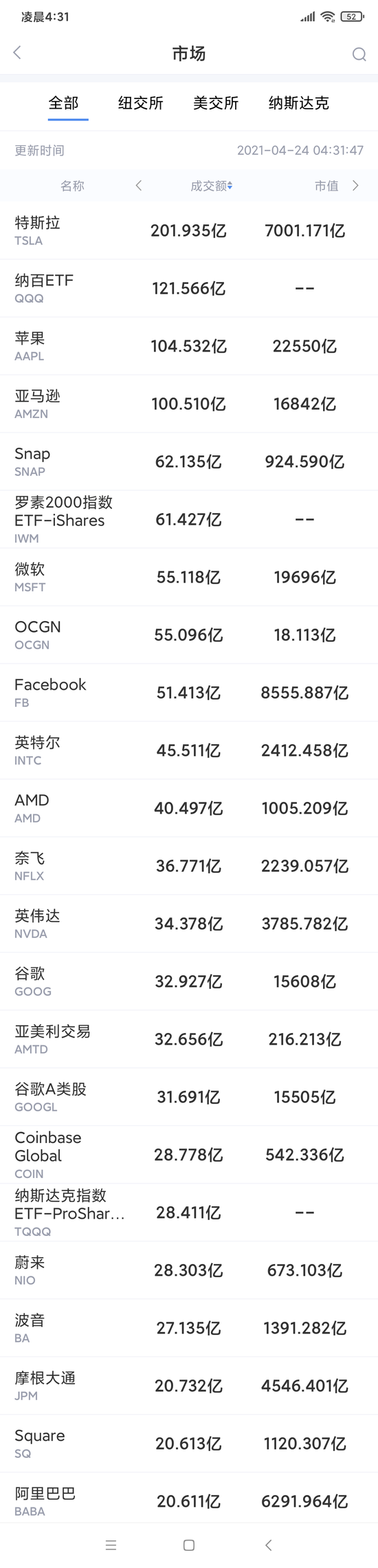 以下为美股当日交易最活跃的20只股票(按成交额):(截图来自新浪财经APP 行情-美股-市场板块 左滑更多数据)下载新浪财经APP